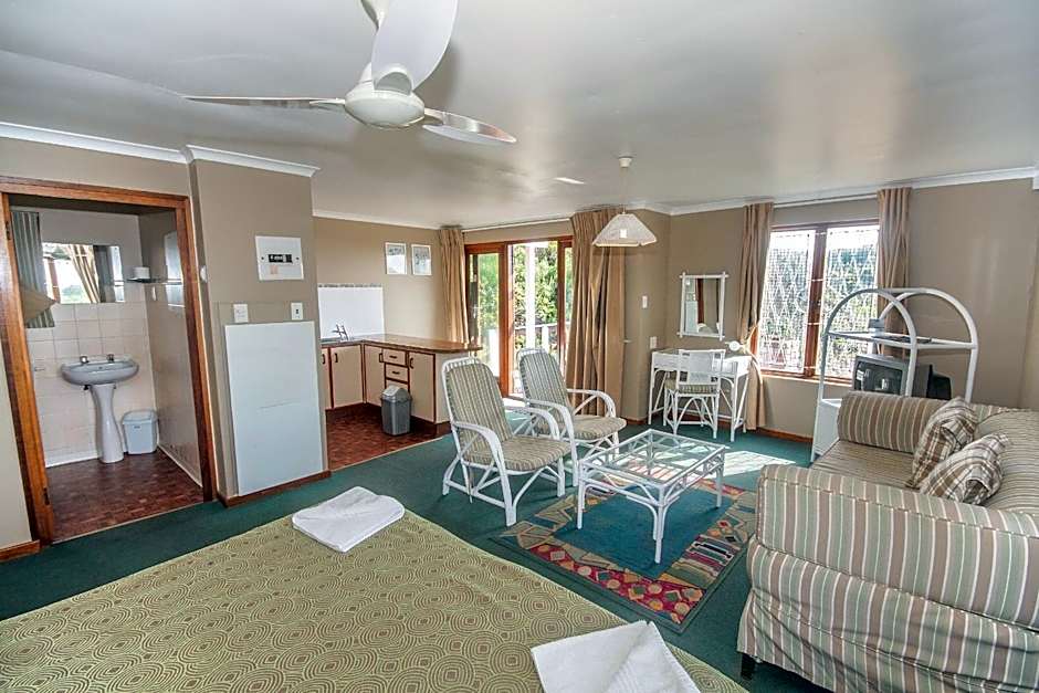These 3-star semi-detached chalets are open plan with a kitchen, lounge area and bathroom. The unit has 2 single beds with a sleeper couch that pulls out into an additional 2 single beds. Each unit has a satellite TV, a private barbecue area, ceiling fan and heater. This unit can be booked with the Chalet with No Kitchen to form an 8-sleeper unit.
